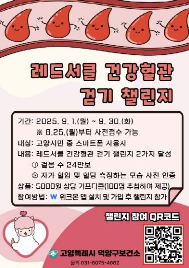 ‘레드서클 건강혈관 걷기 챌린지’는 고양시민이면 누구나 참여할 수 있으며, 2025년 9월 1일(월)부터 9월 30일(화)까지 진행되며, 지난 25일부터 사전신청 받고 있다.