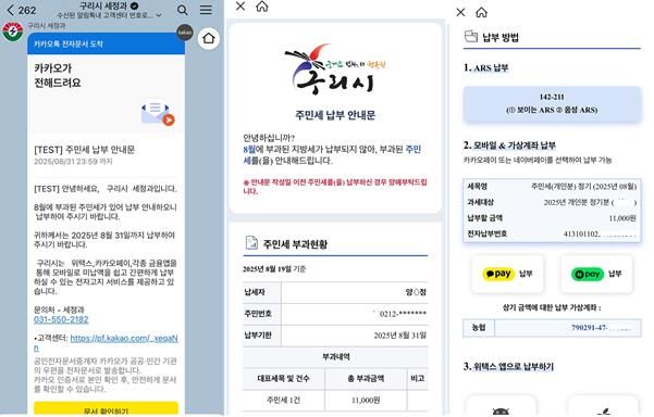 이번 서비스는 종이 고지서의 경우 납세자가 분실하거나 납부 기한을 놓쳐 가산세를 부담하는 등 종이 고지서의 불편한 점을 해소하고자 도입된 것으로, 카카오 알림톡을 통해 지방세(자동차세, 재산세, 주민세 등) 납부 마감 3일에서 5일 전에 부과 내역과 납부 방법을 안내하여 즉시 납부를 지원한다.