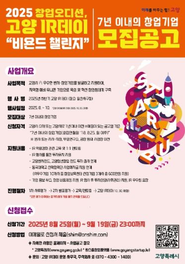 또한 최종 선정된 10개사는 10월 30일 일산서구청에서 개최 예정인 ‘2025 창업오디션, 고양아이알(IR)데이 비욘드 챌린지’에 참가할 수 있는 자격이 주어진다. 액셀러레이터(AC)와 벤처캐피탈(VC)과의 투자유치 및 심사, 아이템 검증, 네트워킹 등에 참여할 수 있다.