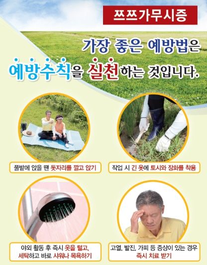 보건소 관계자는 “쯔쯔가무시증은 조기 치료 시 완치가 가능하므로 빠르게 발견하고 치료받는 것이 중요하며, 야외활동 이후 진드기에 물린 자국이 발견되거나 증상이 나타날 시 즉시 의료기관을 방문하여 진료 받을 것”을 강조했다.