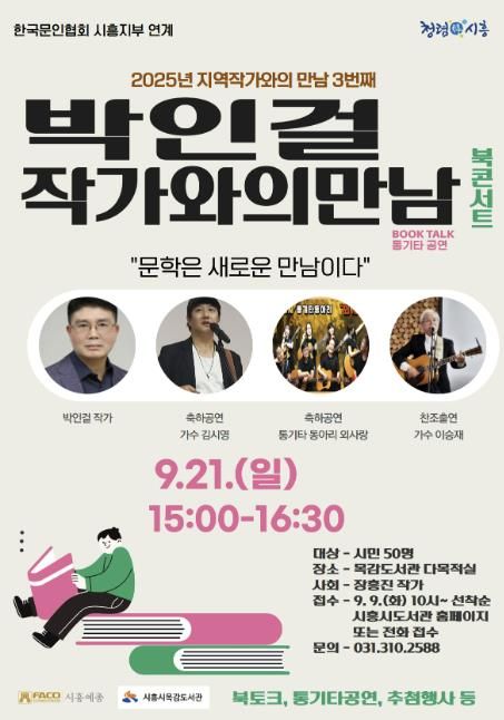 이번 행사는 한국문인협회 시흥지부와 연계해 진행되며, ‘문학은 새로운 만남이다’라는 주제로 시ㆍ소설ㆍ수필 등 다양한 장르를 넘나들며 활발히 활동 중인 박인걸 작가가 독자들과 문학에 대한 생각을 나누는 자리로 꾸며진다.