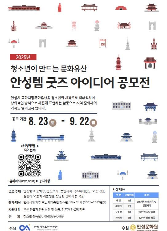 (비전21뉴스) 안성시청소년수련관은 안성시 국가지정문화유산의 가치와 의미를 청소년의 언어와 감각으로 풀어내어, 미래세대가 문화유산 보존과 활성화에 주체적으로 참여할 기회를 마련하고자 ‘청소년이 만드는 안성 문화유산 굿즈 공모전’을 개최한다.