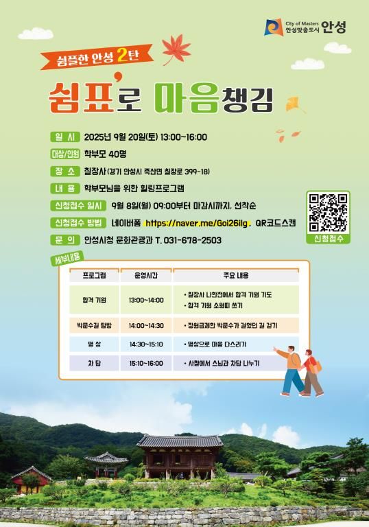 (비전21뉴스) 안성시는 오는 9월 20일 오후 1시부터 4시까지 죽산면 칠장사 일원에서 학부모를 위한 힐링 프로그램 '쉼플한 안성 2탄, 쉼표로 마음챙김'을 운영한다. 이번 행사는 입시를 앞둔 자녀가 있는 학부모들에게 가을 정취 속에서 잠시 멈춤의 시간을 제공하고, 자녀의 건강과 학업 성취를 기원할 수 있도록 마련됐다.