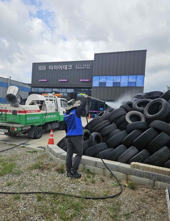 시는 지난 8월 25일부터 29일까지 폐타이어 적치장 51개소에 기동방역반을 투입해 집중 방역을 진행했다. 현장에서 디퍼로 유충 발생 여부를 확인하고, 미생물 유충 구제제를 살포해 모기 개체 수를 줄이는 활동을 전개했다. 앞서 7월 1차로 실시한 폐타이어 적치장 유충구제에서 좋은 효과를 거둔 바 있어, 이번에는 집중호우 이후 2차 방역으로 이어졌다.
