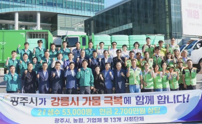 (비전21뉴스) 광주시와 광주농협, 관내 기업체, 13개 민간사회단체는 최근 지속적인 가뭄으로 생활용수 확보에 어려움을 겪고 있는 강릉시에 2리터 생수 53,000병 18톤 트럭 4대 분량을 긴급 지원했다고 5일 밝혔다.
