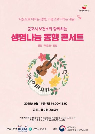 (비전21뉴스) 군포시는 오는 9월 11일 한국장기조직기증원과 함께 생명나눔의 가치를 시민과 공유하고 장기기증 문화 확산을 도모하기 위한 ‘생명나눔 동행콘서트’를 개최한다고 밝혔다.
