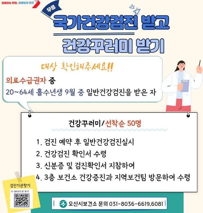 (비전21뉴스) 오산시는 오산시보건소에서 의료급여수급권자의 건강권 보장을 위해 만 20세에서 64세 사이 홀수년도 출생자를 대상으로 하는 국가건강검진 참여를 적극 독려한다고 밝혔다. 또한 9월 중 검진을 완료한 선착순 50명에게는 ‘건강꾸러미’를 제공할 예정이다.
