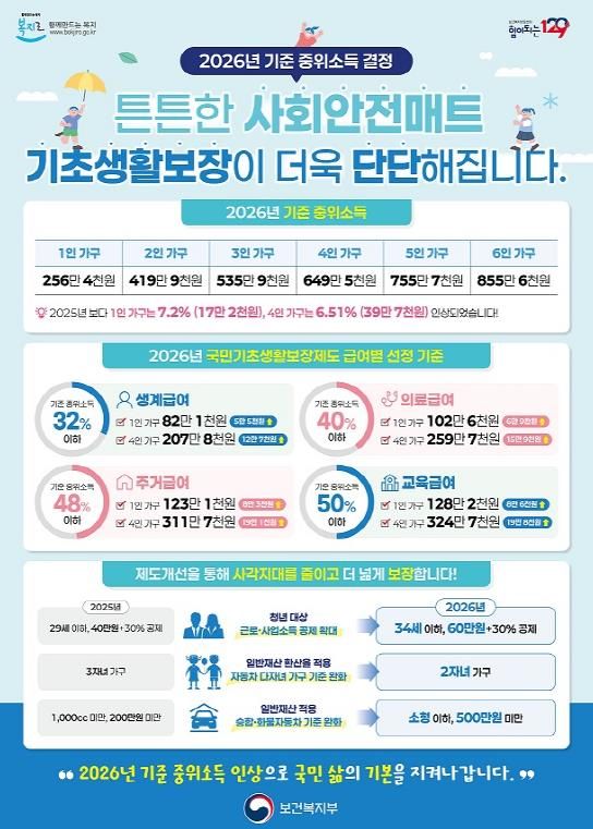 기준 중위소득은 국민 가구소득의 중간값으로 생계·의료·주거급여 등 80여 개 복지사업의 선정 기준으로 활용되며 이번 인상은 4인 가구 기준 역대 최대 폭으로, 내년에는 4인 가구 기준 생계급여가 최대 12만 7,029원이 추가로 지급돼 207만 4,238원의 급여를 받을 수 있게 된다.