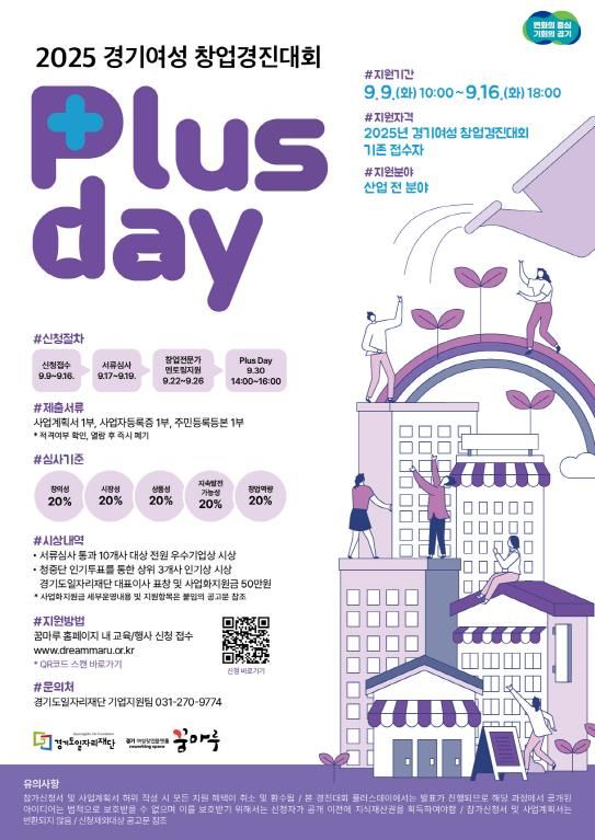 (비전21뉴스=정서영 기자) 경기도와 경기도일자리재단은 9월 9일부터 16일까지 2025년 여성창업경진대회 후속 행사인 ‘Plus Day(플러스 데이)’ 참가자를 모집한다. 이번 행사는 지난 5월 본 대회에서 17대 1의 높은 경쟁률로 아쉽게 탈락한 여성 창업자를 대상으로 마련됐다.