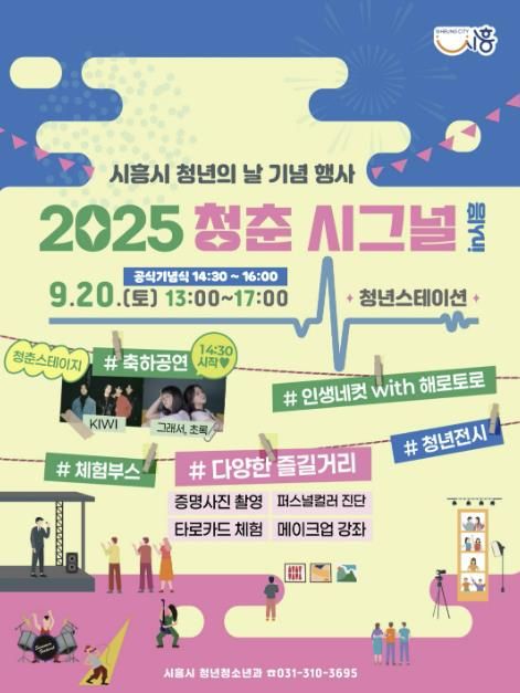 2025년 시흥시 청년의 날 기념행사 '청춘시그널 in 시흥'에는 남녀노소 누구나 참여할 수 있으며, 세부 프로그램과 참여 방법은 시흥시 청년정책 공식 블로그 '시흥청년 알리미'를 통해 확인할 수 있다.