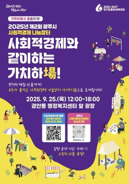(비전21뉴스) 광주시는 오는 25일 낮 12시부터 오후 6시까지 경안동 행정복지센터 앞 광장에서 ‘2025년 제2회 광주시 사회적경제 나눔장터(별칭: 사회적경제와 같이하는 가치하場!)’를 개최한다고 15일 밝혔다.