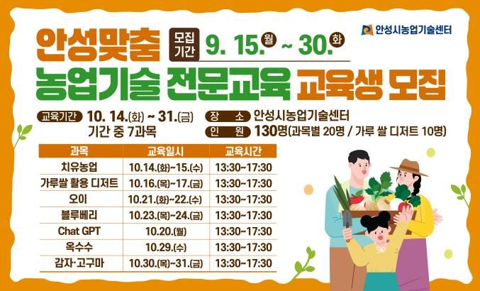 (비전21뉴스) 안성시농업기술센터는 오는 9월 15일부터 30일까지 안성맞춤 농업기술 전문교육 교육생을 모집한다고 밝혔다.