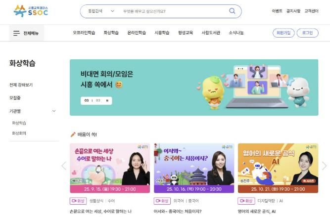 시흥교육캠퍼스 쏙(SSOC)에서 운영 중인 AI 화상학습 시리즈는 매회 300여 명이 신청하고 실시간으로 참여할 정도로 큰 호응을 얻고 있다. 스피치, 노션, 책쓰기 등 전문 분야 화상 강좌 역시 비슷한 수준의 신청과 참여가 이어지며 꾸준한 인기를 끌고 있어, 시민들의 다양한 학습 수요를 충실히 반영하고 있다.