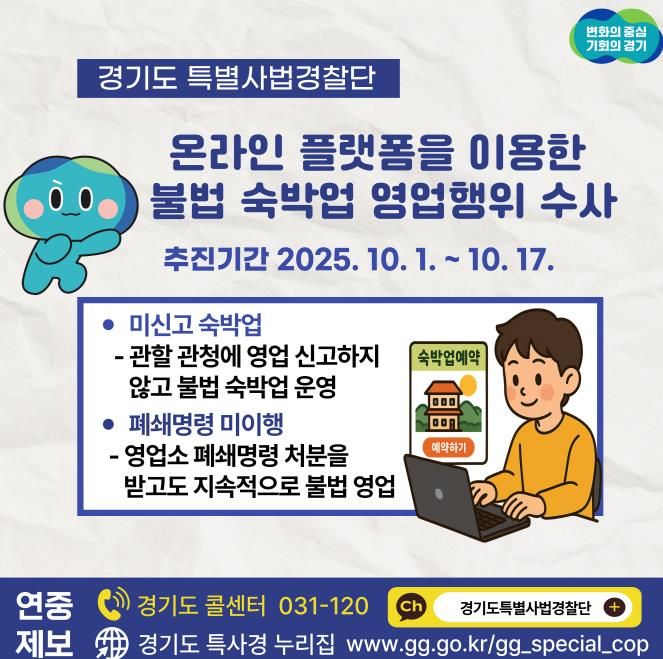 (비전21뉴스) 경기도가 10월 1일부터 17일까지 3주간 온라인 공유 숙박 플랫폼을 이용해 오피스텔 등에서 불법 숙박업을 운영하는 미신고 업소를 집중 단속한다.