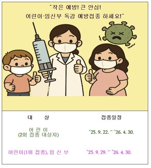 어린이는 ▲생후 6개월 ~ 9세 미만('12. 1. 1.~'25. 8. 31.)인 생애 처음 독감 예방접종은 22일부터,