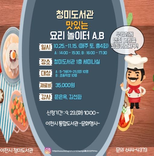 (비전21뉴스) 이천시 청미도서관은 오는 10월 25일부터 11월 15일까지 어린이들을 위한 체험형 요리 프로그램 ‘맛있는 요리 놀이터’를 운영한다.