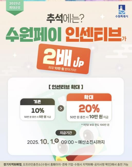 (비전21뉴스) 수원시가 추석 명절을 맞아 10월 수원페이 인센티브를 20%로 확대한다.
