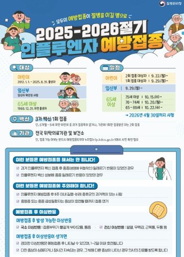 보건소 관계자는 “인플루엔자 예방접종은 어린이, 임신부, 65세 이상 어르신 등 감염 취약계층의 건강을 보호하고, 지역사회 내 인플루엔자 유행을 차단하는 데 매우 중요한 역할을 한다”며, “예방접종을 통해 개인의 건강을 지키는 것은 물론, 가족과 이웃 등 주변 사람들의 안전까지 함께 지켜 달라”고 당부했다.