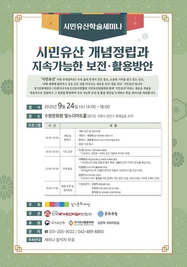 (비전21뉴스) 경기문화재단은 오는 10월 24일 오후 2시, 수원문화원 빛누리아트홀에서 ‘시민유산 개념정립과 지속가능한 보전·활용방안’ 학술 세미나를 개최한다고 밝혔다. 세미나는 문화유산을 소수 전문가의 영역에서 시민 모두의 유산으로 확장하고, 그 가치를 지속가능하게 보전, 활용하는 방안을 모색하기 위해 기획됐다.