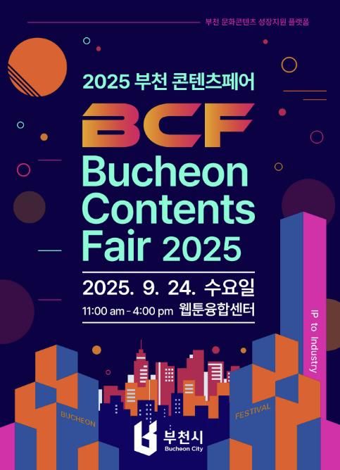 (비전21뉴스) 부천시는 9월 24일 오전 11시 웹툰융합센터에서 ‘2025 부천 콘텐츠페어’를 연다. 이번 행사는 ‘From IP to Industry’를 주제로 우수 콘텐츠 지식재산권(IP)의 비즈니스 확장, 투자유치, 판로개척을 지원하기 위해 마련됐다.