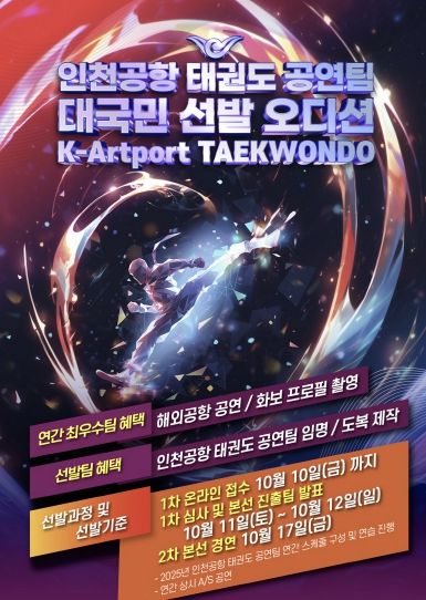 (비전21뉴스) 인천국제공항공사는 인천공항에서 진행되는 태권도 상설공연인 ‘2025-2026 인천공항 태권도 상설공연’에 참여할 태권도 전문 공연팀을 공개 모집한다고 28일 밝혔다.