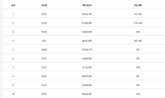2위 김상현과 10위 김태우(27.(주)하이니스임플란트)의 포인트 격차는 22,659.96포인트다. 또한 10위 김태우와 13위 이승형(22), 17위 김범수(27)와 포인트 차는 각각 10,221.45포인트, 12,766.24포인트다. 10위 김태우와 20위 하충훈(35.㈜일신테크놀로지)와 차이는 16,500.06포인트다.