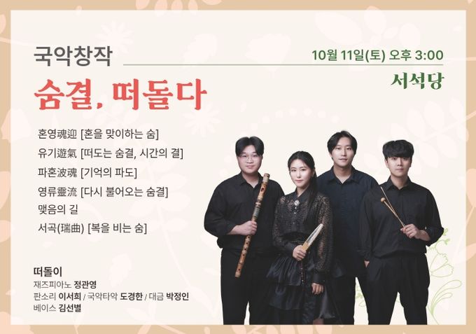 사람은 태어나고, 관계를 맺으며 살아가고, 언젠가 떠난다. 그러나 떠난다고 해서 모든 것이 사라지는 것은 아니다. 우리가 남긴 기억과 흔적은 주변 사람들의 마음속에서 순환하며, 삶과 죽음의 경계를 허문다. 퓨전국악 단체 떠돌이의 '숨결, 떠돌다'는 만남과 이별, 떠돎과 순환이라는 삶의 본질을 음악으로 풀어낸 무대다. 한국 전통 음악의 뿌리를 기반으로 하면서도 현대적 감각을 더한 이 공연은, 익숙하면서도 새로운 음악적 경험을 통해 생과 사의 의미를 되새기는 시간을 선사한다.