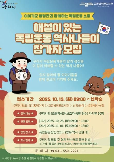 (비전21뉴스) 구리시는 오는 10월 13일부터 27일까지 교문 방정환 도서관에서 진행하는 ‘해설이 있는 독립운동 역사 나들이’ 프로그램의 참여자를 모집한다고 밝혔다.