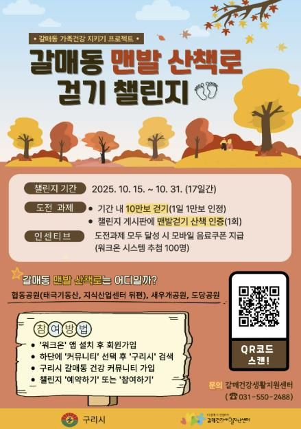 (비전21뉴스) 구리시는 가을철 주민들의 건강한 생활 습관 형성과 스트레스 완화를 위해 ‘갈매동 맨발 산책로 걷기 챌린지’를 오는 10월 15일부터 31일까지 17일간 운영한다고 밝혔다.