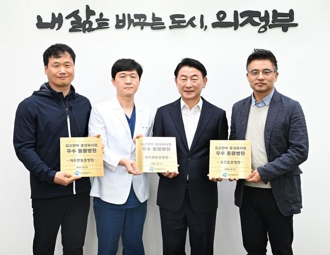 (비전21뉴스) 의정부시는 10월 15일 시장실에서 ‘길고양이 중성화사업 우수 동물병원’ 인증패 전달식을 열고, 사업에 적극 참여해 지역 동물복지 문화 확산에 기여한 동물병원을 격려했다.