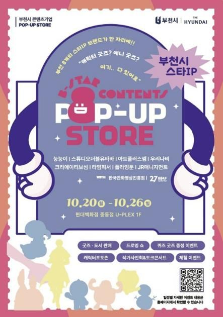 (비전21뉴스) 부천시는 10월 20일부터 26일까지 현대백화점 중동점 U-PLEX 1층에서 지역 우수 콘텐츠 기업 8개 사가 참여하는 팝업스토어 ‘8 CONTENTS, ONE STAGE in BUCHEON’을 운영한다.