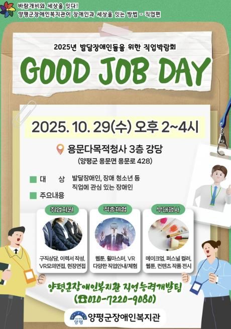 (비전21뉴스) 대한불교조계종사회복지재단이 운영하는 양평군장애인복지관은 오는 29일 오후 2시부터 4시까지 용문다목적청사 3층 강당에서 발달장애인의 직업 탐색 기회를 지원하기 위한 직업박람회 ‘GOOD JOB DAY’를 개최한다.