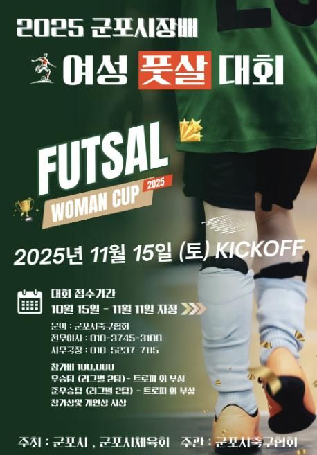(비전21뉴스) 군포시는 여성 생활체육 참여 확대와 건전한 스포츠 문화 확산을 위해 ‘2025 군포시장배 여성 풋살대회’를 오는 11월 15일(토) 군포시 국민체육센터 축구장에서 개최한다.