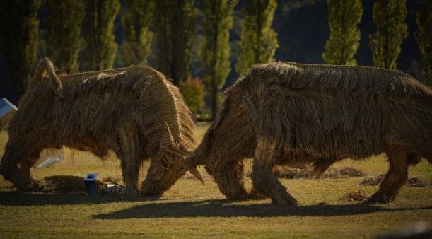 (비전21뉴스) 아름다운강천 사회적협동조합은 경기문화재단의 지원을 받아 ‘지붕 없는 박물관’ 사업의 일환으로 2025년 강천섬에 짚으로 만든 황소 조형물 두 건을 설치했다. 이번 작품은 소싸움을 연상시키는 역동적인 구도로 제작되어, 자연 속에서 생동감 넘치는 예술적 장면을 연출했다.