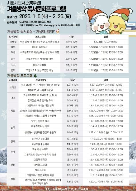 다양한 주제로 펼쳐지는 ‘겨울독서교실’은 각 도서관의 특화주제에 맞춰 어린이들의 상상력과 사고력을 자극하는 프로그램으로 꾸려졌다. 도서관별 세부 프로그램은 ▲소래빛도서관 ‘책과 함께 떠나는 두근두근 도서관 탐험대’ ▲대야도서관 ‘흥나는 놀이독서’ ▲목감도서관 ‘세계문학으로 배우는 마음 성장 독서 여행’▲능곡도서관 ‘예술과 만나는 세계 문화 여행’ ▲장곡도서관 ‘마음건강 톡톡’ ▲은계도서관 ‘그림책으로 읽는 포근한 세상’ 등이다.