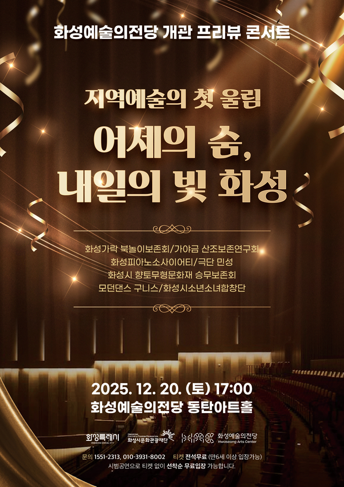 (비전21뉴스=정서영 기자) 화성시가 새로운 문화예술의 중심지로 조성한 화성예술의전당이 개관을 앞두고 오는 12월 20일 동탄아트홀에서 프리뷰 콘서트 ‘지역예술의 첫 울림, 어제의 숨 · 내일의 빛’을 개최한다. 이번 공연은 화성 지역 예술의 과거와 현재, 그리고 미래 비전을 한 무대에 담아내는 스토리텔링 기반 멀티장르 퍼포먼스로 구성된다.