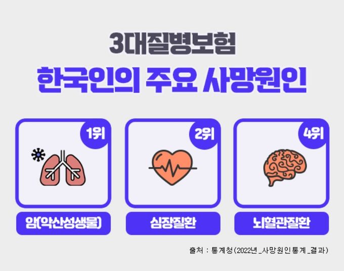 (비전21뉴스) 흔히 3대질병이라 일컫는 암, 심혈관질환, 뇌혈관질환은 통계청 발표자료에 따르면 한국인의 주요 사망원인 중에서 3위 폐렴을 제외하고 1~4위를 차지하고 있으며, 이전부터 지금까지도 살면서 가장 먼저 대비해야 하는 치명적인 질병으로 강조되고 있다. 이러한 중대질병에 대비하기 위하여 상기 세가지 치명적인 질병을 집중보장하는 3대질병진단비보험을 많이 가입하고 있다. 3대진단비보험은 각각의 질병을 중점적으로 보장하면서도 가입자 특성에 맞는 특약을 추가함으로써 종합건강보험으로도 활용할 수가 있다.