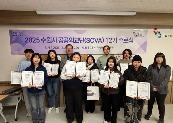 (비전21뉴스) 수원시국제교류센터가 22일 센터에서 ‘수원시 공공외교단(SCVA) 12기’ 수료식을 열고, 단원 16명에게 수료증을 전달했다. 우수활동자 4명에게는 상장을 수여했다.