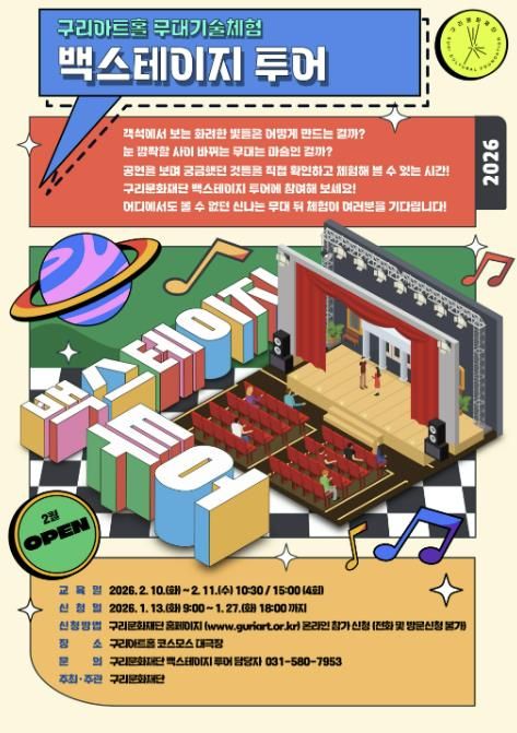 (비전21뉴스) 구리문화재단은 〈무대 기술 체험 백스테이지 투어 프로그램〉 참가자를 오는 1월 13일 오전 9시부터 1월 27일 오후 6시까지 재단 홈페이지를 통해 선착순 모집한다고 밝혔다.
