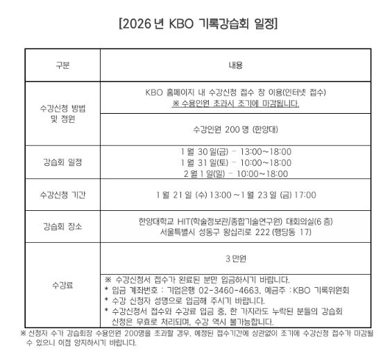 (비전21뉴스) 2026년 KBO 기록강습회가 1월 30일(금)부터 2월 1일(일)까지 서울 한양대학교에서 개최된다. 기록강습회는 야구 공식기록법의 보급과 이해를 통한 저변 확대를 목적으로 프로야구 원년인 1982년부터 개최됐다.