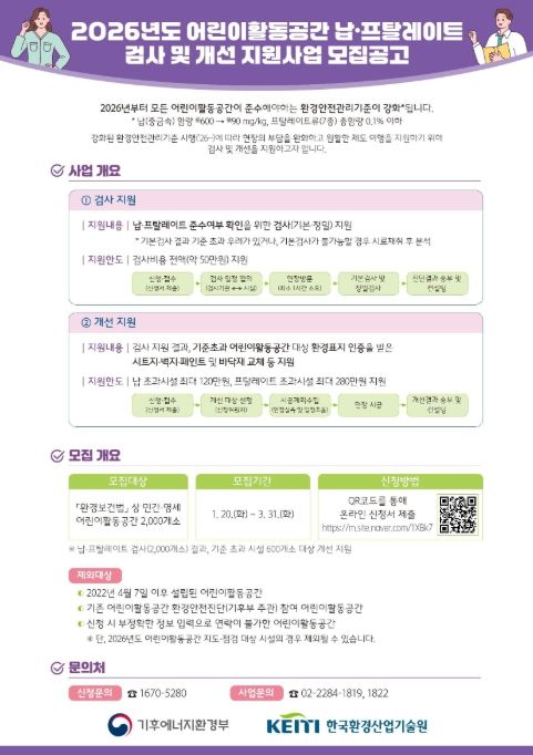 (비전21뉴스) 기후에너지환경부와 한국환경산업기술원은 어린이 활동공간에 새롭게 적용되는 환경안전관리기준에 따라 ‘납’과 ‘프탈레이트’에 대한 검사를 지원하고, 기준을 초과한 시설에 대해서는 개선 지원을 추진한다고 밝혔다.