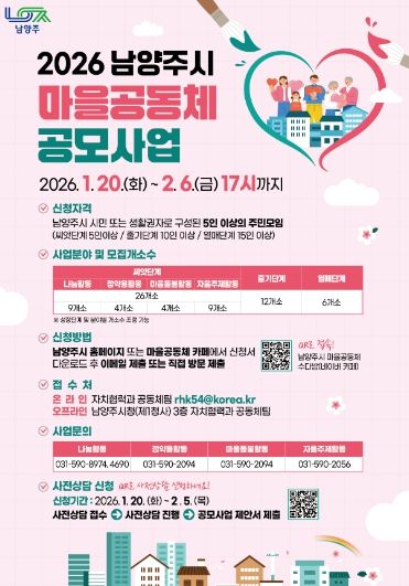 신청은 1월 20일부터 2월 6일 오후 5시까지 시청 자치협력과 공동체팀 방문 또는 전자우편을 통해 접수할 수 있다. 신청서와 세부 안내 자료는 시 누리집 또는 ‘남양주시 마을공동체’카페에서 내려받을 수 있다.