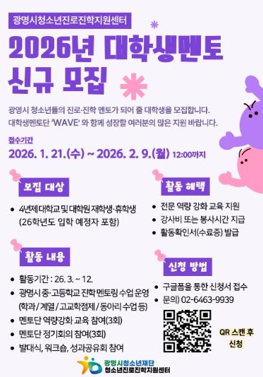 (비전21뉴스) 광명시청소년재단 청소년진로진학지원센터는 관내 중·고등학교 청소년 대상 학과 멘토링 운영을 위해 ‘2026년 대학생 멘토단(wave)’을 모집한다고 밝혔다.
