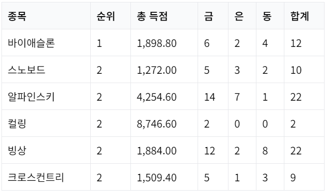다관왕 선수들도 눈에 띈다. 이찬호 선수는 바이애슬론과 크로스컨트리 부문에서 각각 금메달을 획득해 이번 대회에서 세 개의 금메달을 가져갔다. 박채이 선수와 양지훈 선수는 알파인스키 부문에서 두 개씩 금메달을 수확했다. 빙상에서는 염승윤 선수가 두 종목에서 우승하며 두 개의 금메달을 추가했다.
