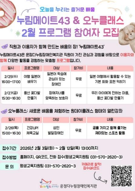 (비전21뉴스) 파주시 운정다누림장애인복지관은 참여형 평생학습 프로그램 ‘누림메이트43’을 운영하며, 정규 강좌로는 담기 어려운 소규모 학습 수요를 반영한 생활 밀착형 배움을 실천하고 있다.