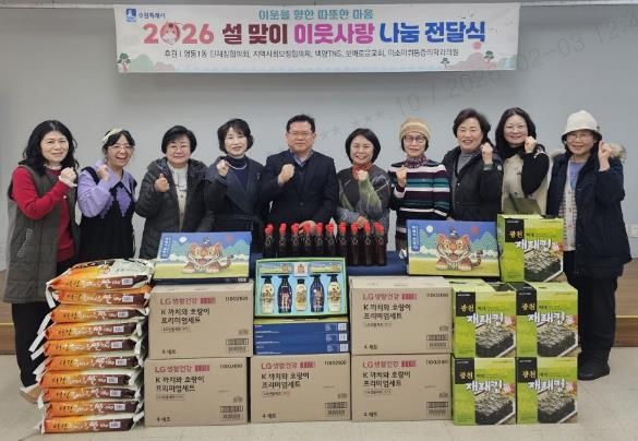 (비전21뉴스) 영통구 영통1동은 지난 3일 영통1동 단체장협의회가 설 명절을 앞두고 관내 저소득 이웃을 위한 ‘설 맞이 이웃사랑 나눔 전달식’을 진행했다고 밝혔다.