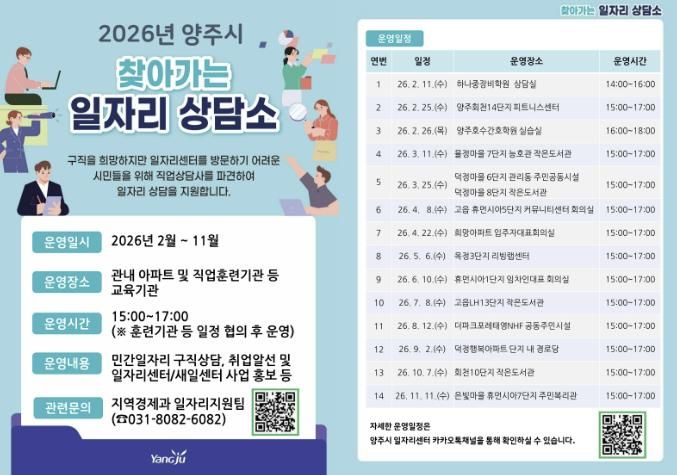 (비전21뉴스) 양주시가 구직 현장의 문턱을 낮추고 시민들의 취업 성공률을 높이기 위해 오는 11월까지 ‘2026년 찾아가는 일자리 상담소' 를 운영한다.