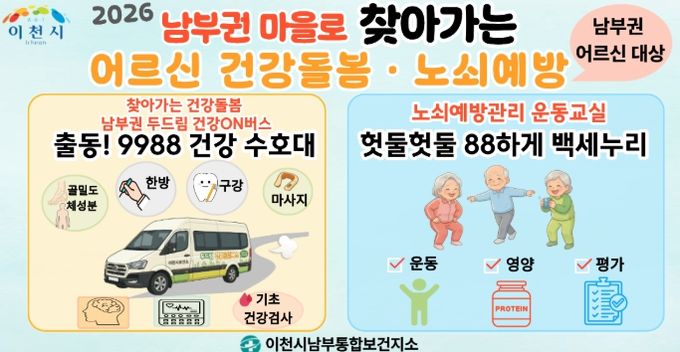 (비전21뉴스) 이천시는 남부권 어르신을 대상으로 의료 접근성을 높이기 위한 ‘출동! 9988 건강수호대’와 운동교실에 노쇠예방관리를 접목한 ‘헛둘헛둘 88하게 백세누리’ 사업을 2026년 본격 운영한다.
