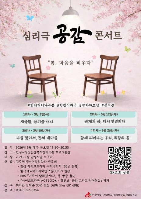 (비전21뉴스) 안성시보건소 안성시정신건강복지센터(부설 자살예방센터)는 시민의 정신건강 증진과 생명존중 문화 조성을 위해 심리극(사이코드라마) 기법을 활용한 체험형 집단 프로그램 '공감' 콘서트를 오는 3월 운영한다고 밝혔다.