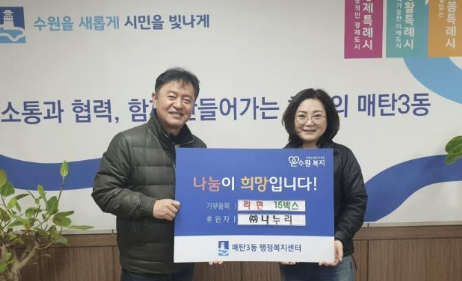 (비전21뉴스) 수원시 영통구 매탄3동 행정복지센터는 지난 6일, 관내 폐기물 수거업체인 ㈜나누리로부터 설 명절을 맞아 어려운 이웃을 위한 라면 15박스를 기탁받았다고 밝혔다.